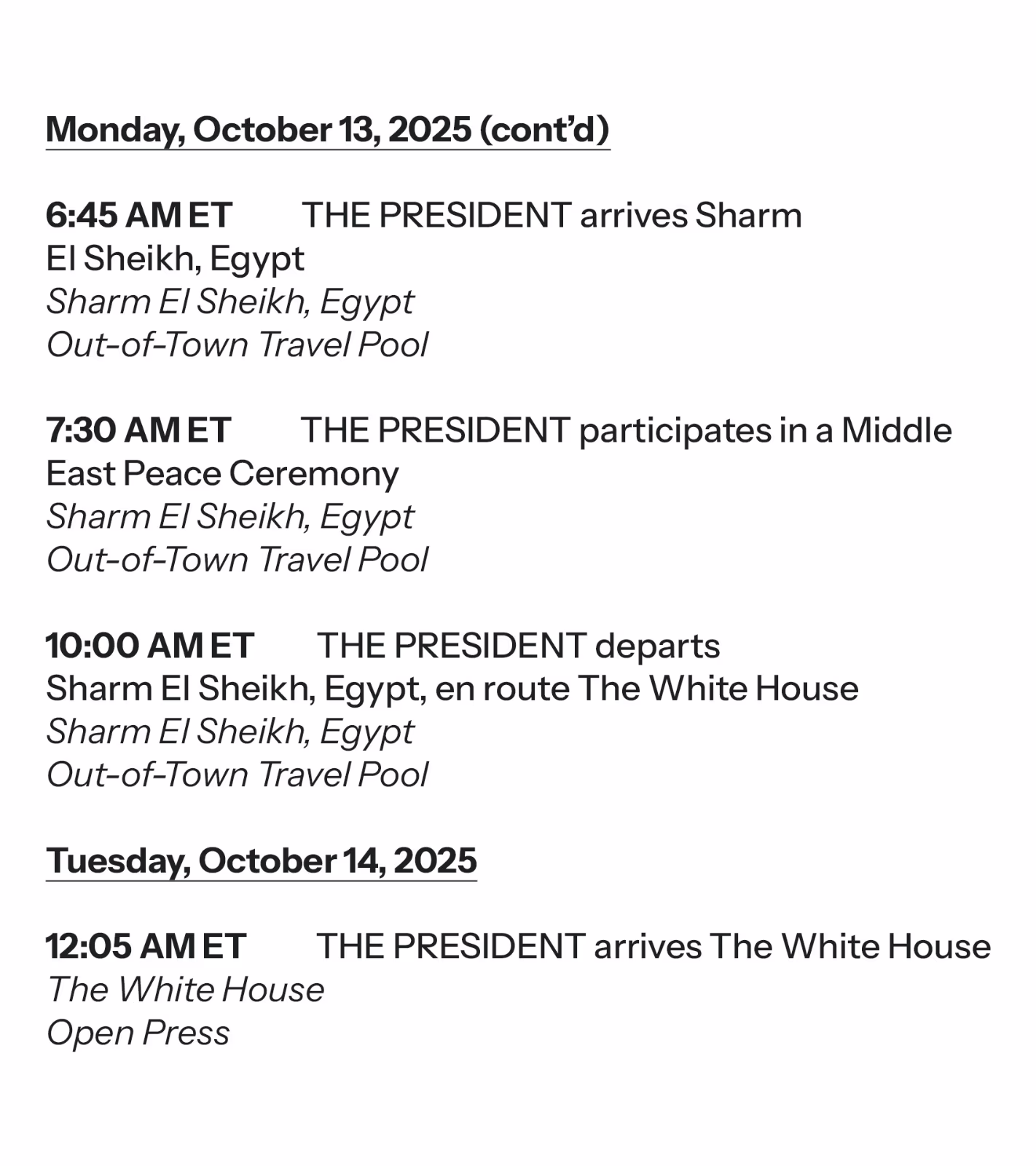 Trump will return to the White House on Tuesday morning, following his announcement of the initial agreement phase for a ceasefire in Gaza between Israel and Hamas. As per the agreement, reports suggest the Israeli Defense Forces are withdrawing from Gaza though occasional flare-ups persist.
