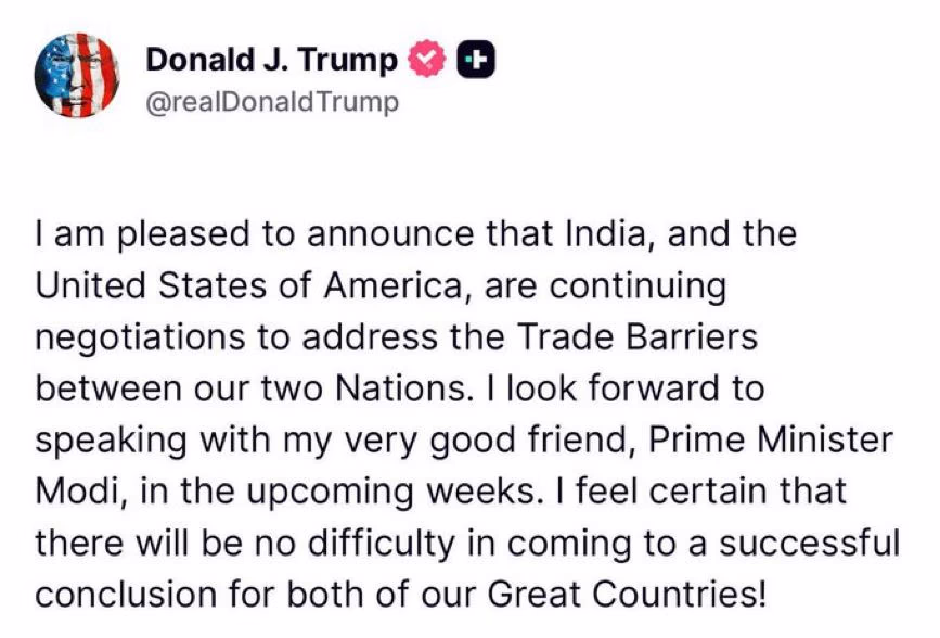 Trump took to the social media platform, Truth Social, to share his joy in announcing that India and the U.S. are diligently working to overcome trade obstacles. He stated, 'I am keen to engage in discussions with my very good friend, Prime Minister Modi, in the weeks ahead. I have no doubt that these talks will conclude successfully for our two great nations.'