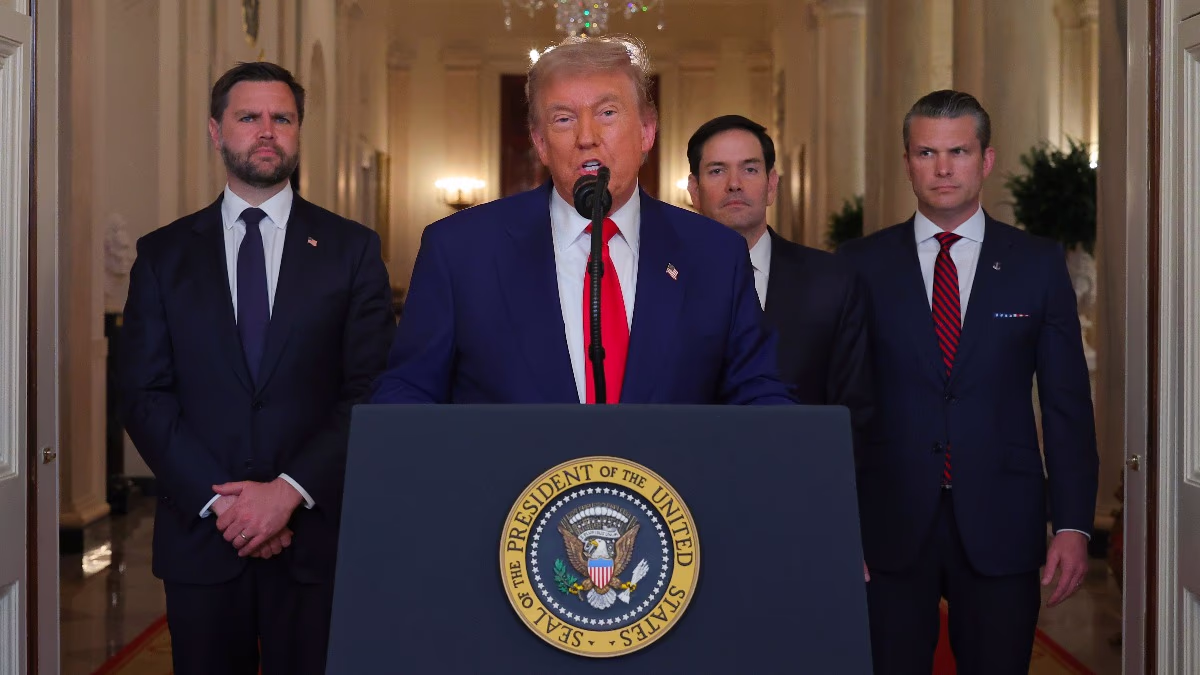 US strikes on Iran provoked criticism not only from Democrats but also within Trump's 'America First' movement. By choosing to address the nation alongside three close advisors, the president attempts to unify his party, shielding himself from opposition targets.