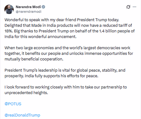 Following America's tariff reduction announcement, PM Modi expressed his gratitude in a post on 'X', thanking President Trump. Modi wrote, 'It was a pleasure chatting with my dear friend President Trump today. Thrilled that tariffs on Made-in-India products have been slashed to 18%. On behalf of India's 1.4 billion people, a heartfelt thank you to President Trump for this significant announcement. When the world's largest democracies and economies collaborate, our people directly benefit, and immense possibilities for mutual cooperation arise. President Trump's leadership is crucial for global peace, stability, and prosperity. India fully supports his peace efforts and looks forward to closely collaborating to elevate India-US partnership to unprecedented heights.'