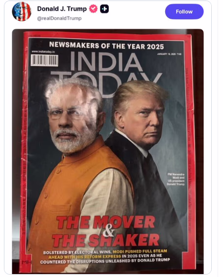 On Monday, US President Donald Trump posted the cover of India Today magazine's 'Newsmakers of the Year 2025', featuring a captivating image with Prime Minister Narendra Modi, on his social media platform 'Truth Social'. The headline on the cover read 'The Mover & The Shaker'. Interestingly, Trump's post was devoid of any caption, leaving many to ponder over the intended message.