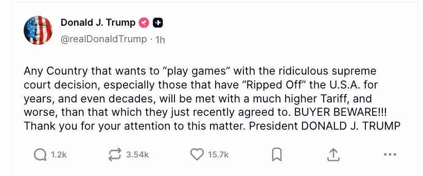 "If any country tries to exploit this ruling and 'play games', especially those that have exploited the U.S. for years, they will face even higher tariffs than before. More alarmingly, tariffs surpassing those agreed in trade deals would be enforced."