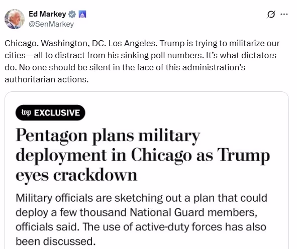 In fact, Democratic leaders have described Trump's recent actions as tyrannical, stating that Trump is militarizing cities. A party senator remarked, "Trump is trying to militarize our cities to divert attention from his declining poll ratings. This is what dictators do."