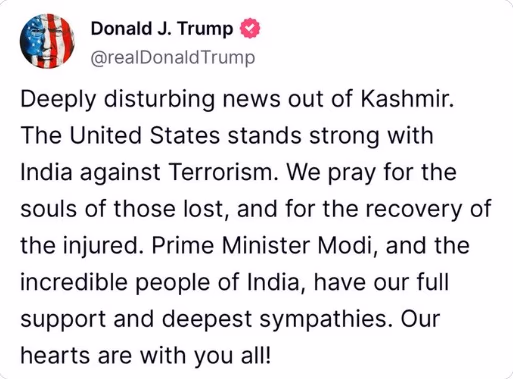 President Trump expressed profound concern over the Pahalgam attack news from Kashmir. The U.S. stands firm with India against terrorism, praying for victims' peace and wishing the injured a quick recovery. Prime Minister Modi and India have our unwavering support and deep sympathy.