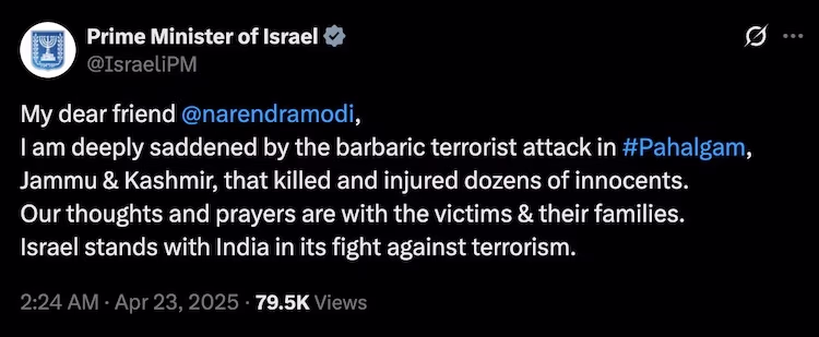 Israeli Prime Minister Benjamin Netanyahu expressed his sorrow over the ruthless terrorist attack in Pahalgam. Israel stands with India in combating terrorism. Israeli Foreign Minister Gideon Saar also condemned the attack.