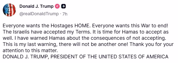 Trump stated, "Everyone wants the hostages to come home, and everyone wants this war to end. The Israelis have agreed to my terms; it's time for Hamas to do the same. I've warned Hamas of the consequences of rejecting this offer—this is my final warning; there will be no more."