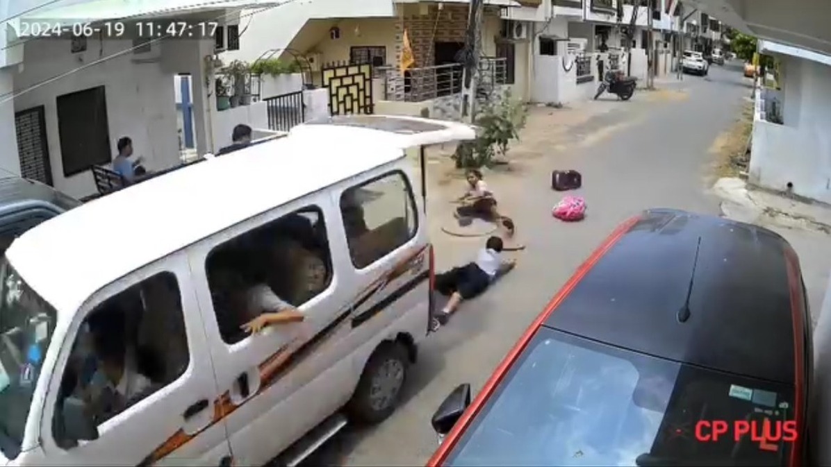 A chilling CCTV footage from the Manjalpur area of Vadodara, Gujarat is making rounds on the internet. It captures a moment of terror as two schoolgirls suddenly fall onto the street from the rear door of a school van. It was a stroke of luck that no vehicles were trailing the speeding van, or it might have ended in tragedy for both girls.