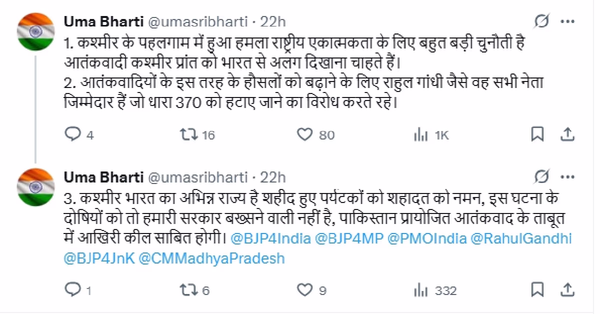 Amid the shockwaves of the recent terrorist attack in Pahalgam, Jammu & Kashmir, former Chief Minister of Madhya Pradesh, Uma Bharti, has issued a stern statement. She describes the attack as a significant challenge to national unity, highlighting the ongoing attempts by terrorists to separate Kashmir from India.