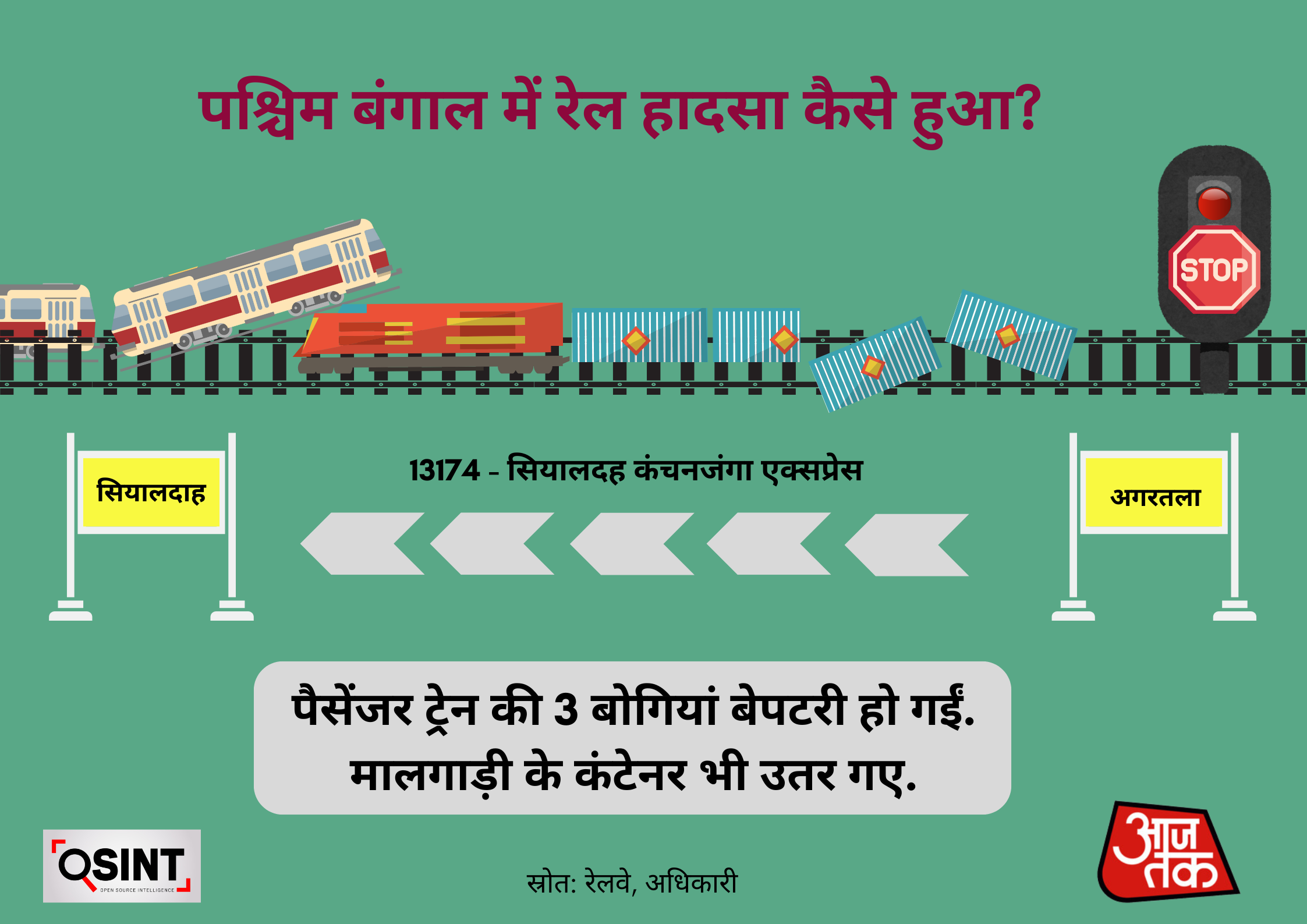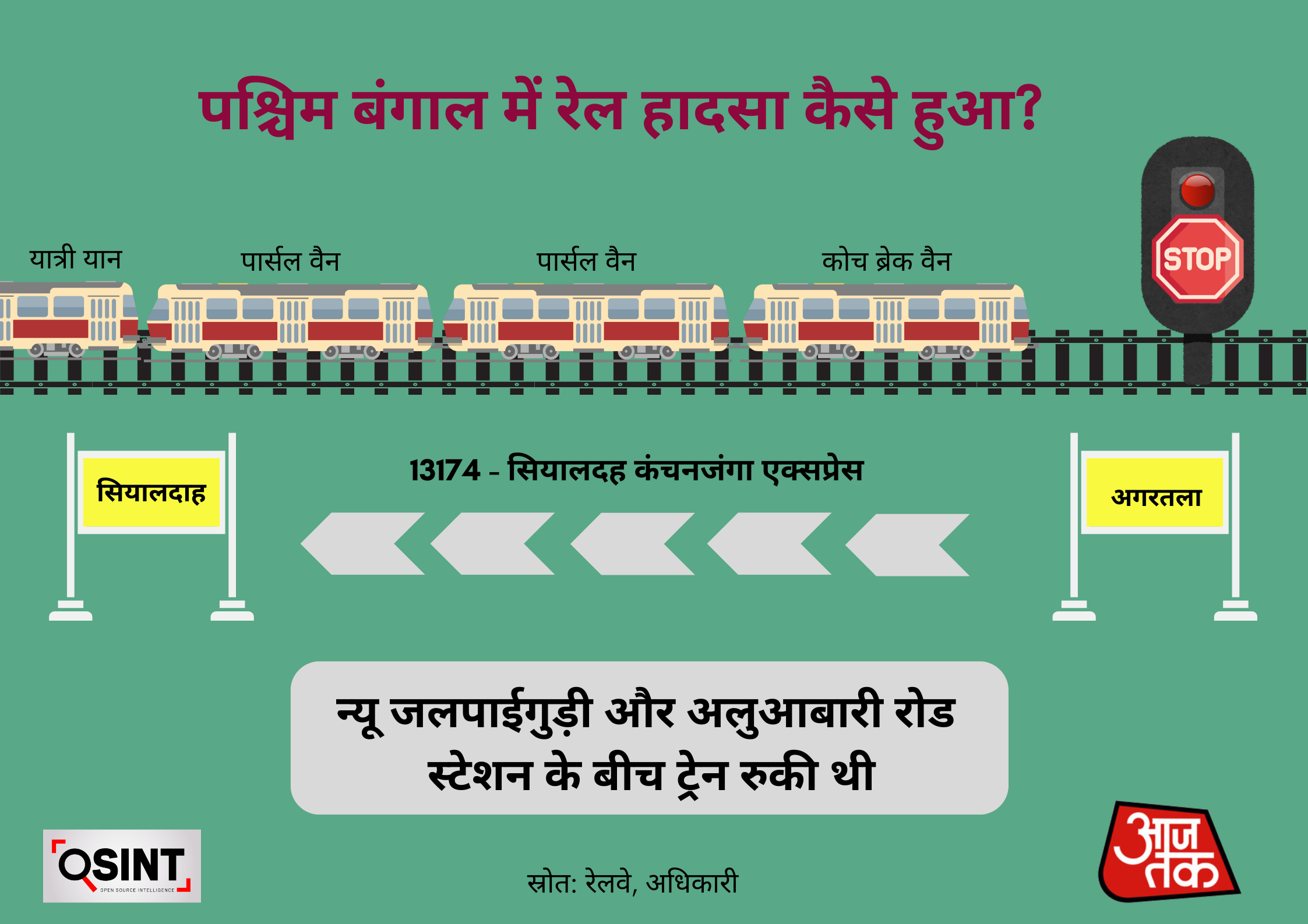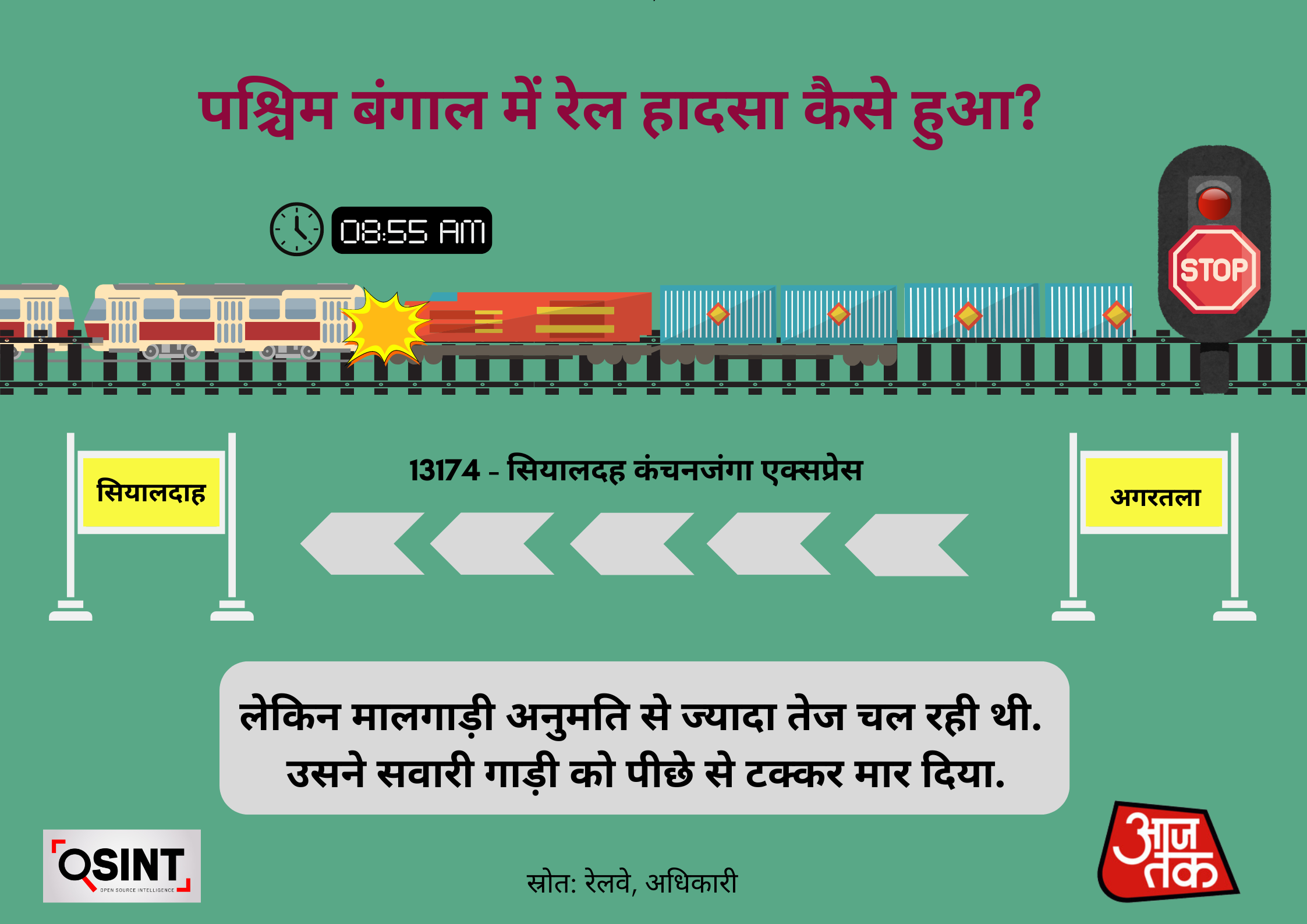 The collision occurred when a goods train rear-ended the Kanchanjunga Express, which was travelling from Agartola to Sealdah. The incident also resulted in the fatalities of the freight train's driver and the passenger train's guard.