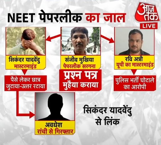 There is suspicion that the NEET-UG paper was also leaked from Hazaribagh. This time the candidates were kept in Patna and the leaked paper was brought to Patna. Sanjeev Mukhiya's gang is believed to have been involved in this leak, as with the BPSC teacher recruitment exam, and is active in the NEET as well. Dr. Shiv, Sanjeev Mukhiya's son, is currently in jail in connection with the BPSC teacher recruitment exam paper leak. He was arrested along with four accomplices on April 21st from Ujjain. Shiv's name had also come up in the 2017 NEET paper leak case, and a case had been registered against him at Patna's Journalist Colony police station.