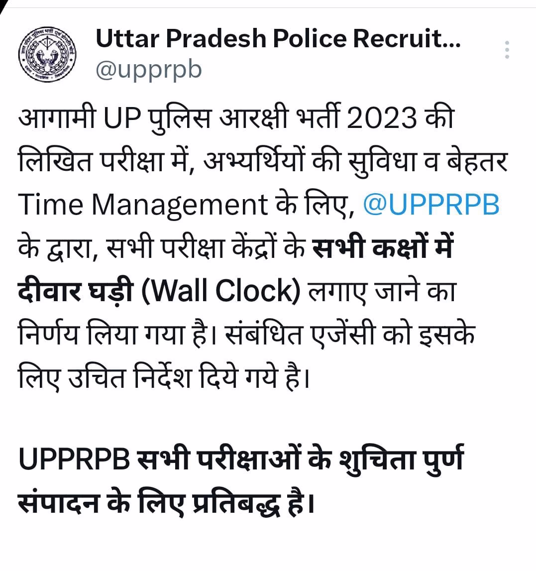The board shared this information on its social media account 'X' (formerly Twitter), stating, 'For the upcoming UP Police Constable Recruitment 2023 written exam, wall clocks will be installed in every room of all exam centers for better time management and convenience of the candidates. Appropriate instructions have been given to the concerned agency. UPPRPB is committed to conducting all exams with utmost integrity.'