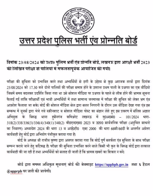 The UP Police Recruitment Board lodged an FIR at the Husain Ganj police station after investigating the viral video. Charges have been filed under relevant sections of BNS 318(2)/338/336(3)/336(4)/340 (1)/340 (2), along with Section 13 of the Uttar Pradesh Public Examinations (Prevention of Unfair Means) Ordinance and Sections 66 C and D of the IT Act.
