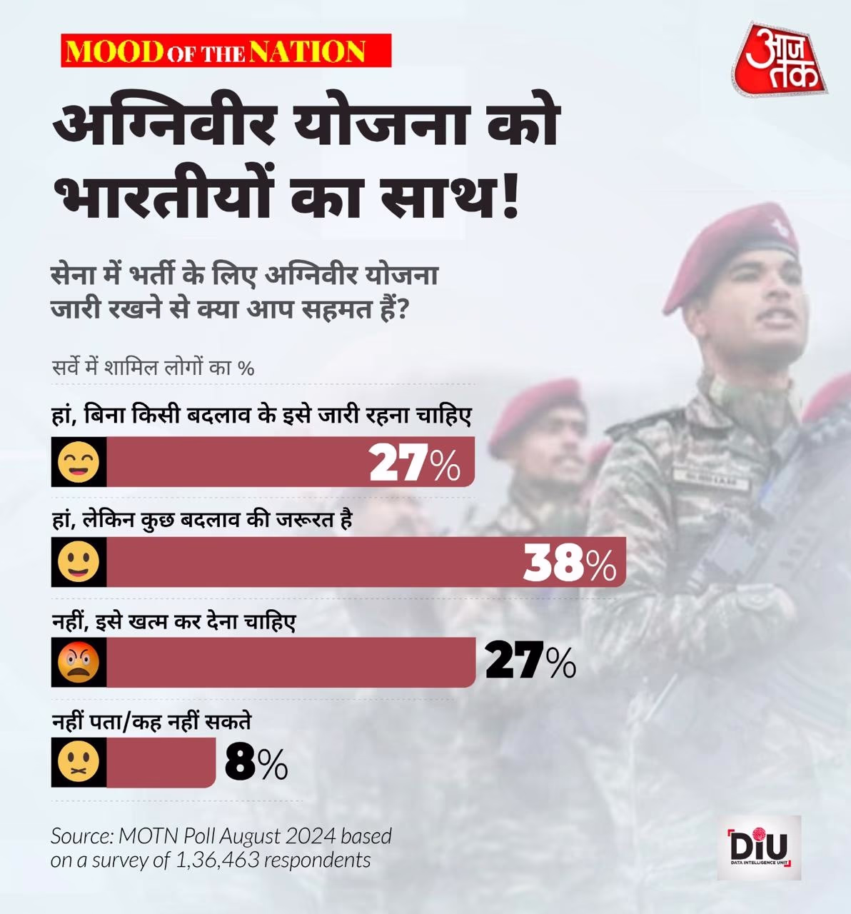However, it's also true that in the India Today Mood of the Nation survey, 65% of respondents supported the Agniveer scheme. Of these, 27% wanted the scheme to continue without changes, while 38% felt it should continue with some modifications.