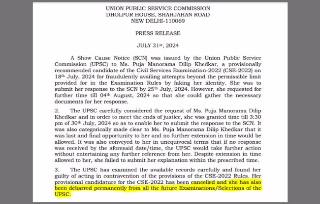 On July 18, UPSC issued a show-cause notice to Puja, requiring her response by July 25. She requested an extension until August 4, leading UPSC to grant time until July 30, stressing it was her final chance. Despite this, Puja failed to provide a satisfactory explanation.