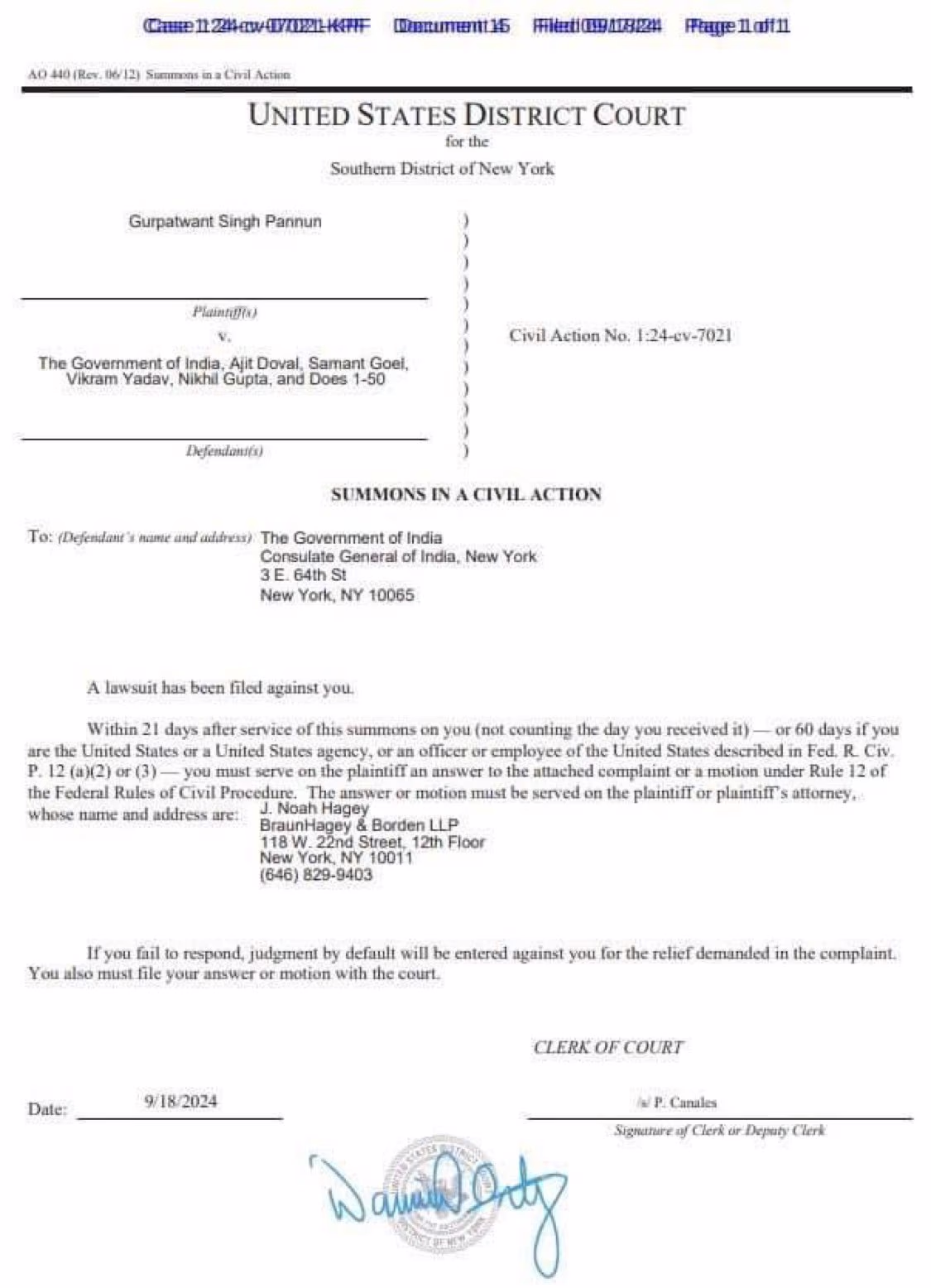 The Southern District Court of New York has summoned the Indian government, National Security Advisor Ajit Doval, former RAW Chief Samant Goel, along with accused Nikhil Gupta and Vikram Yadav in the assassination case.