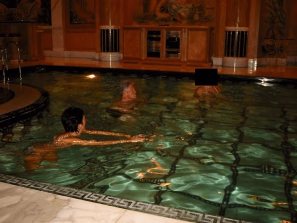 A striking image captures Bill Clinton with Ghislaine Maxwell at a swimming pool, while another features Clinton with Michael Jackson and Diana Ross of The Supremes.