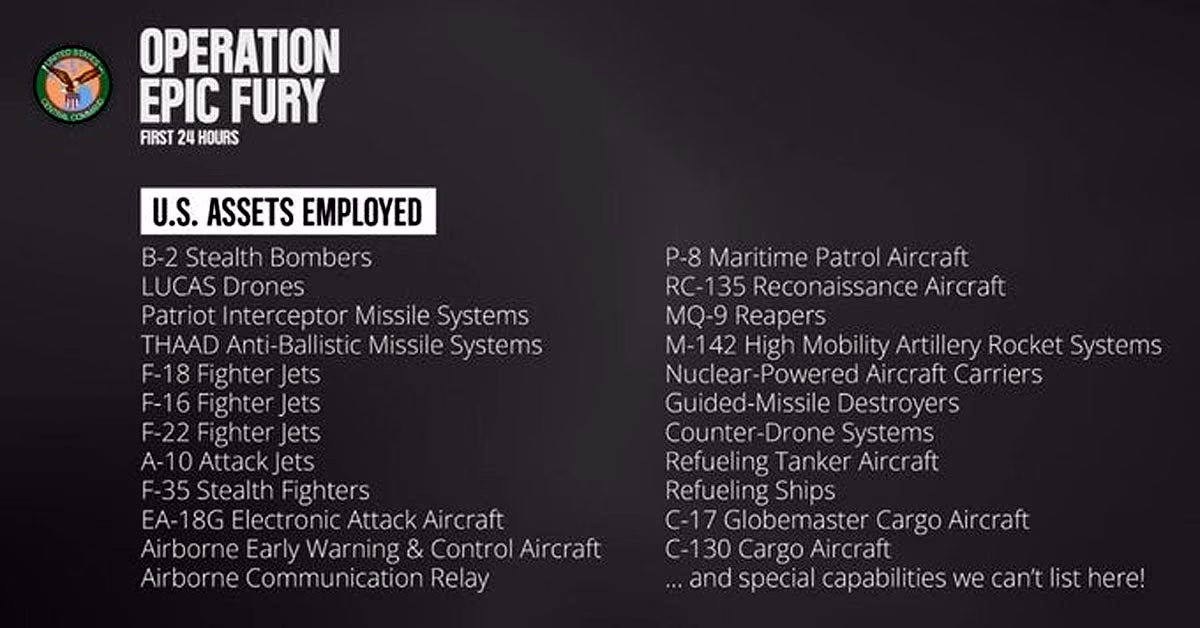 The United States launched an extensive attack on Iran in the first 24 hours of Operation Epic Fury. Centcom (U.S. Central Command) released an infographic detailing the primary weapons and systems deployed by the U.S. These weapons targeted over 1000 sites in Iran, including ballistic missile locations, air defenses, naval ships, command centers, and IRGC locations.