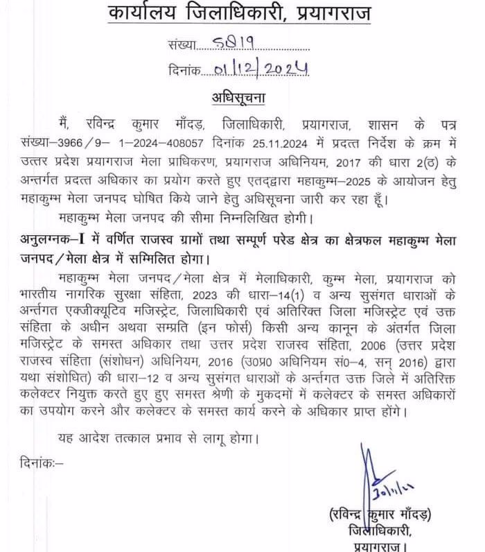 According to the notification, 25 villages from Tehsil Sadar, 3 villages from Tehsil Soraon, 20 villages from Phulpur Tehsil, and 19 from Karchana Tehsil have been included. The Mahakumbh will be held between January 13 and February 26. During this Mahakumbh, there will be six royal baths.