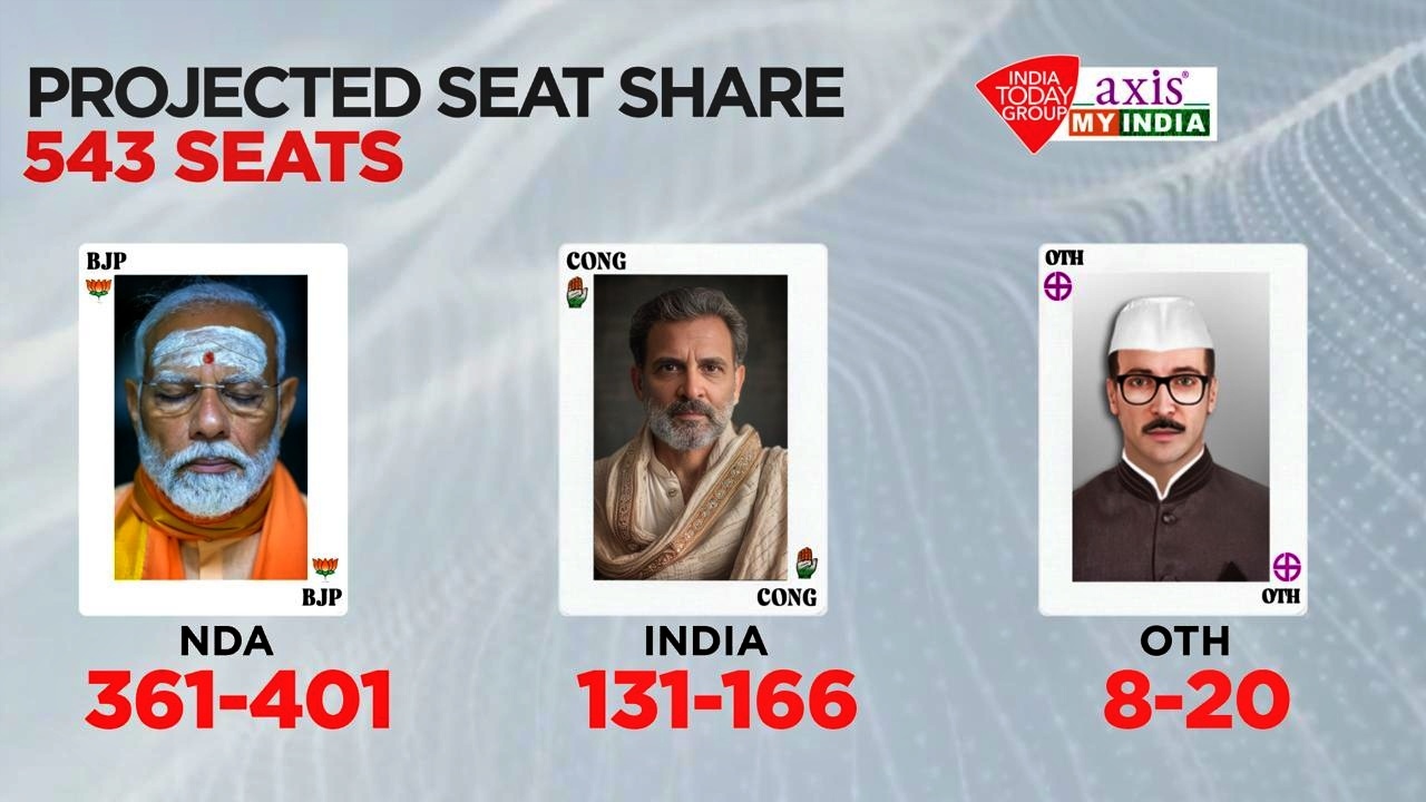 The India Today-Axis My India exit poll signals another term for the NDA government. With the votes in for the country's 543 Lok Sabha seats, the crystal ball of exit polls has illuminated the likely outcomes. The poll hints at a sweeping victory for NDA with an estimated 361-401 seats, INDIA could secure 131-166, and others may get 8-20 seats.