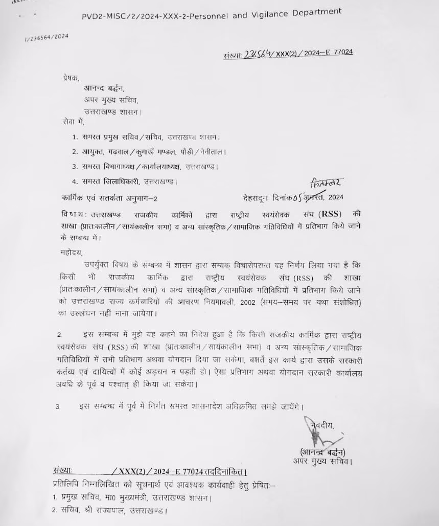 Additional Chief Secretary Anand Vardhan mentioned in his order that the government has decided that participation in RSS branches (morning/evening sessions) and other cultural and social activities by any state employee will not be considered a violation of the Uttarakhand State Employees Conduct Rules, 2002.