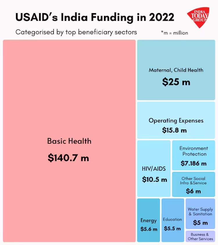 Official figures show that of the total $228 million fund for 2022, USAID India spent $140.7 million (or nearly 50%) on basic health, $25.09 million on maternal and child health, $10.57 million on HIV/AIDS prevention and awareness programs, $7.186 million on general environmental protection, and $5.6 million on energy.