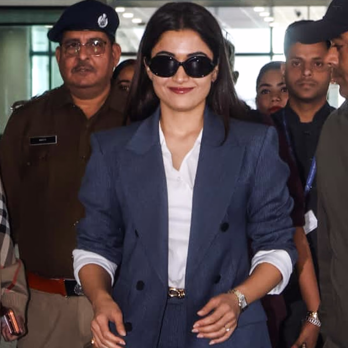Before the wedding, Rashmika showcased a stunning boss lady look. Clad in a white pant suit, topped with a navy blazer and complemented by her loose hair and subtle makeup, she exuded confidence and style.
