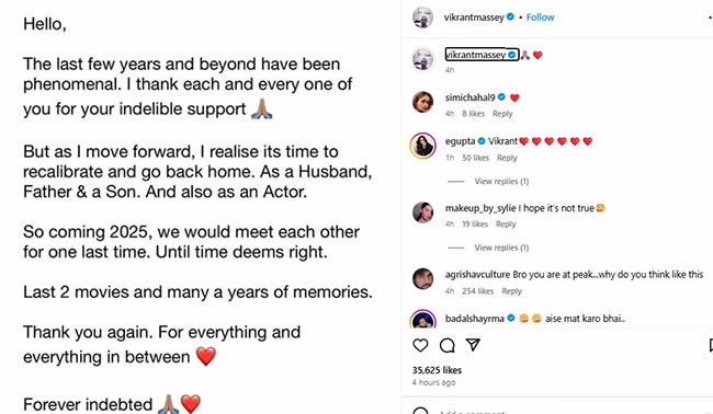 Vikrant further wrote - In the upcoming year of 2025, we shall meet for the last time until the timing is right. Two final movies and countless memories. For everything that happened in between, I thank you all again. I will be eternally grateful for that.