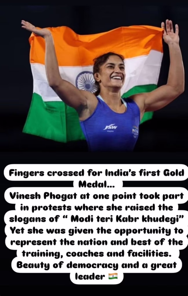 Meanwhile, actress and BJP MP from Himachal Pradesh Kangana Ranaut expressed her reaction to Vinesh Phogat's major victory. She wrote on her Instagram story, 'Praying for India to get its first gold. Vinesh Phogat once participated in a protest saying 'Modi teri kabar khudegi'. Despite that, she got the chance to represent the country, receiving the best training, coaches, and facilities. This is the beauty of democracy and great leadership.'