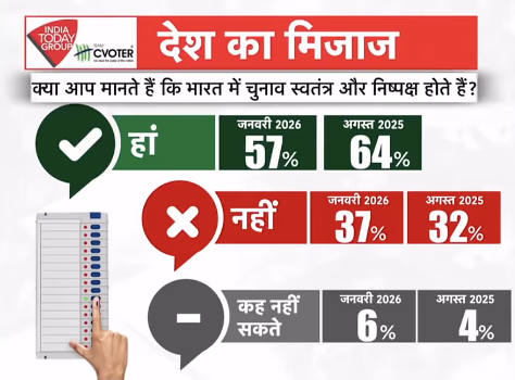 The renowned and trusted India Today–CVoter 'Mood of the Nation' survey results have been released. The survey sought public opinions regarding the freedom and fairness of elections in India. It also posed questions about the SIR process and the use of investigative agencies.