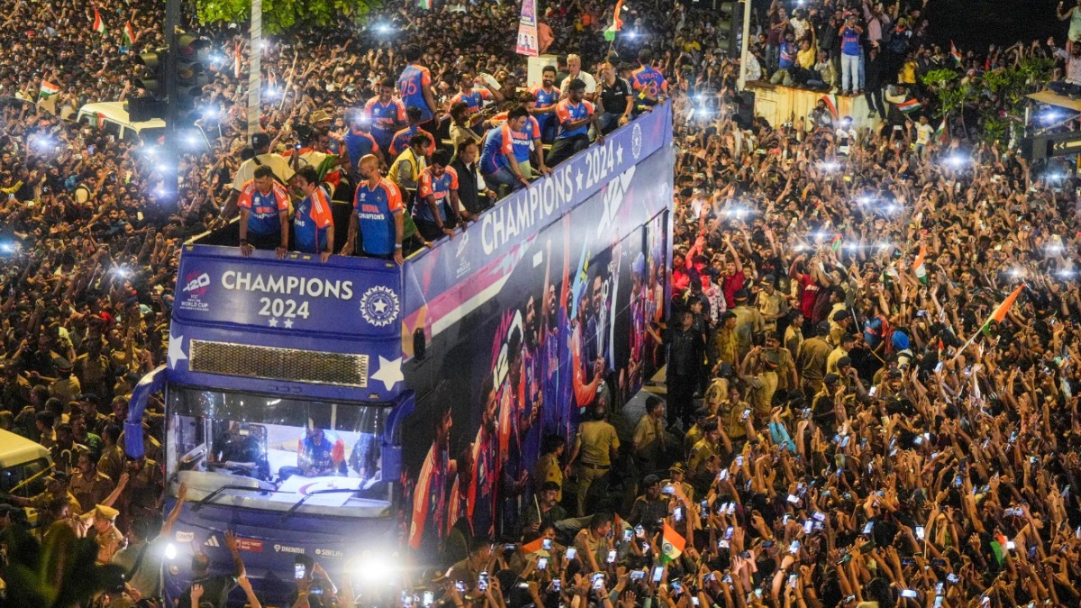In spite of drizzles, fans chanted their names and waved the national flag as the players exited the Indira Gandhi International Airport. A huge crowd gathered, with a special cake ready for the champions. Captain Rohit Sharma and Jay Shah sliced the cake before proceeding on. Riding on the cheers of 'India-India', the players boarded the bus one by one. At the hotel, the celebration atmosphere was even more vibrant with drums and music. As Rohit and Suryakumar Yadav descended from the bus, they immersed themselves in the rhythm, performing a lively Bhangra. The hotel lobby was brimming with people, each eagerly waiting for a glimpse of the world champions.