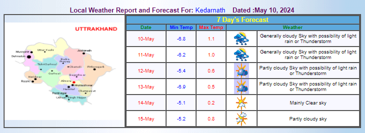Kedarnath is situated in the Rudraprayag district of Uttarakhand. The region too has received a yellow alert. From May 10th to 13th, sporadic thunderstorms, lightning strikes, and hail are predicted, along with the possibility of gusty winds of 40-50 km/h intensifying to 50-60 km/h starting May 11th.
