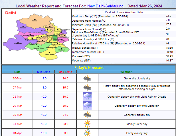As per the Meteorological Department, New Delhi will experience rainfall on the 28th of March. The minimum temperature on the 29th of March could be 19 degrees, and the maximum could reach 35 degrees. Light rain activities are also possible. On the 30th of March, the minimum temperature in New Delhi is predicted to be 19 degrees, and the maximum to be 34 degrees, with cloudy skies expected.
