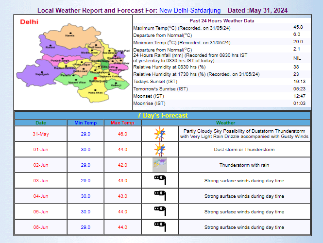 The heat torment continues in Delhi, with no relief even in the early morning hours. The minimum daytime temperature also hovers around 30°C. Ayanagar in Delhi reported a soaring temperature of 47°C yesterday. As for today, June 1st, the capital may witness thunder accompanied by rain and dusty storms, followed potentially by severe heatwave conditions which may lessen subsequently.