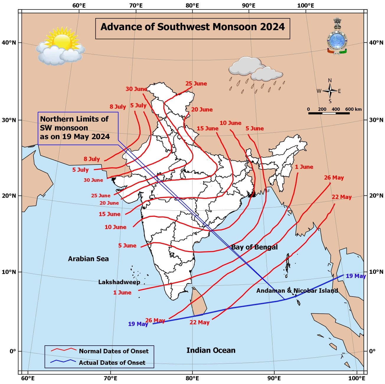 The Southwest monsoon typically arrives in Kerala around June 1st, moving northwards and covering the entire country by July 15th. It precedes this by hitting the Andaman and Nicobar Islands on May 22nd. However, this year, the monsoon arrived in the Andaman Islands three days ahead of the usual schedule, on May 19th.