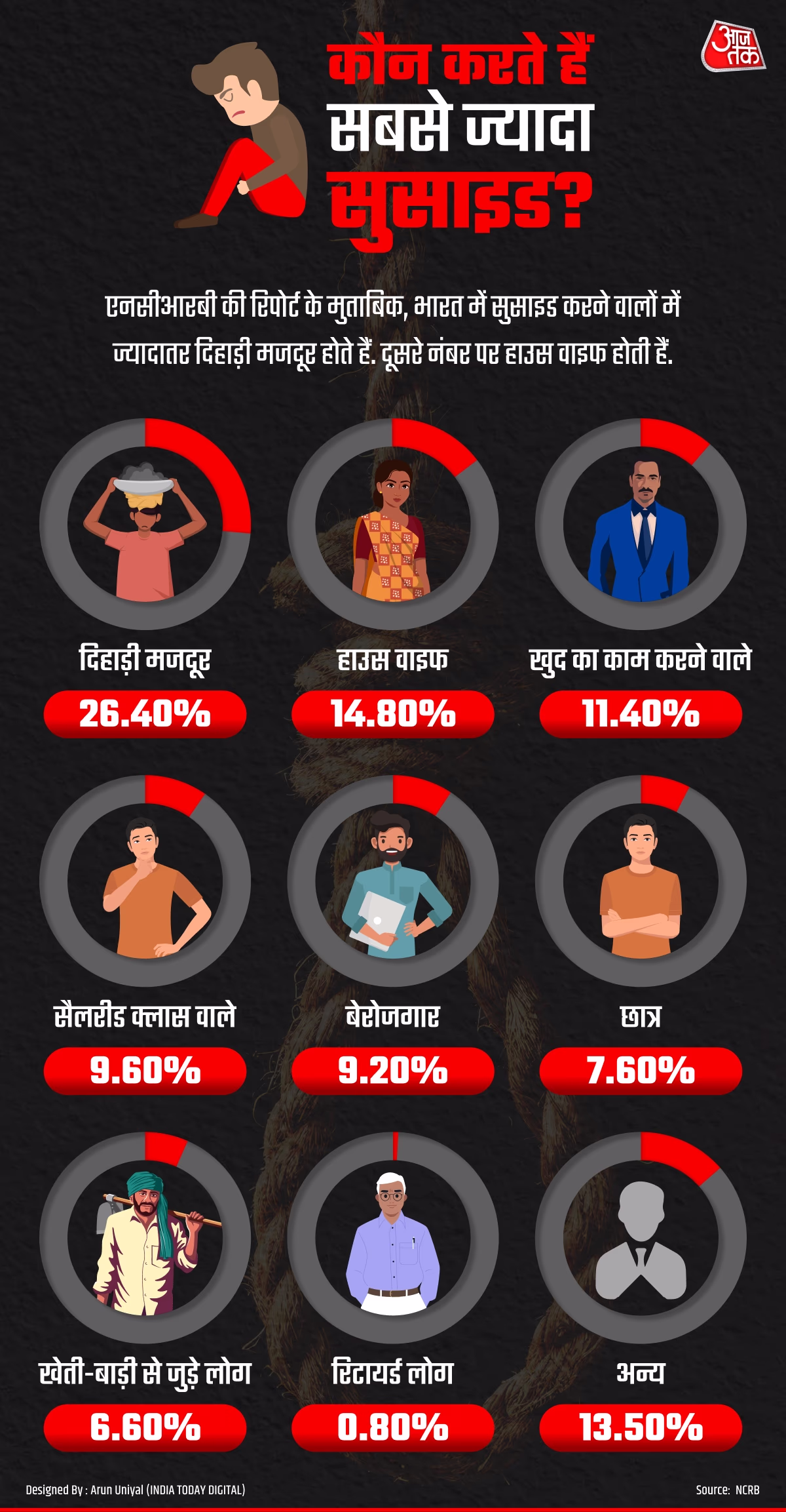 NCRB's report also discusses the reasons behind suicides. It states that the majority of suicides are due to family problems and illnesses (like AIDS, cancer, etc.). Last year, 32% of suicides were due to family issues, and 19% were because of illnesses. However, the report does not specify the reasons for suicides among men and women separately.