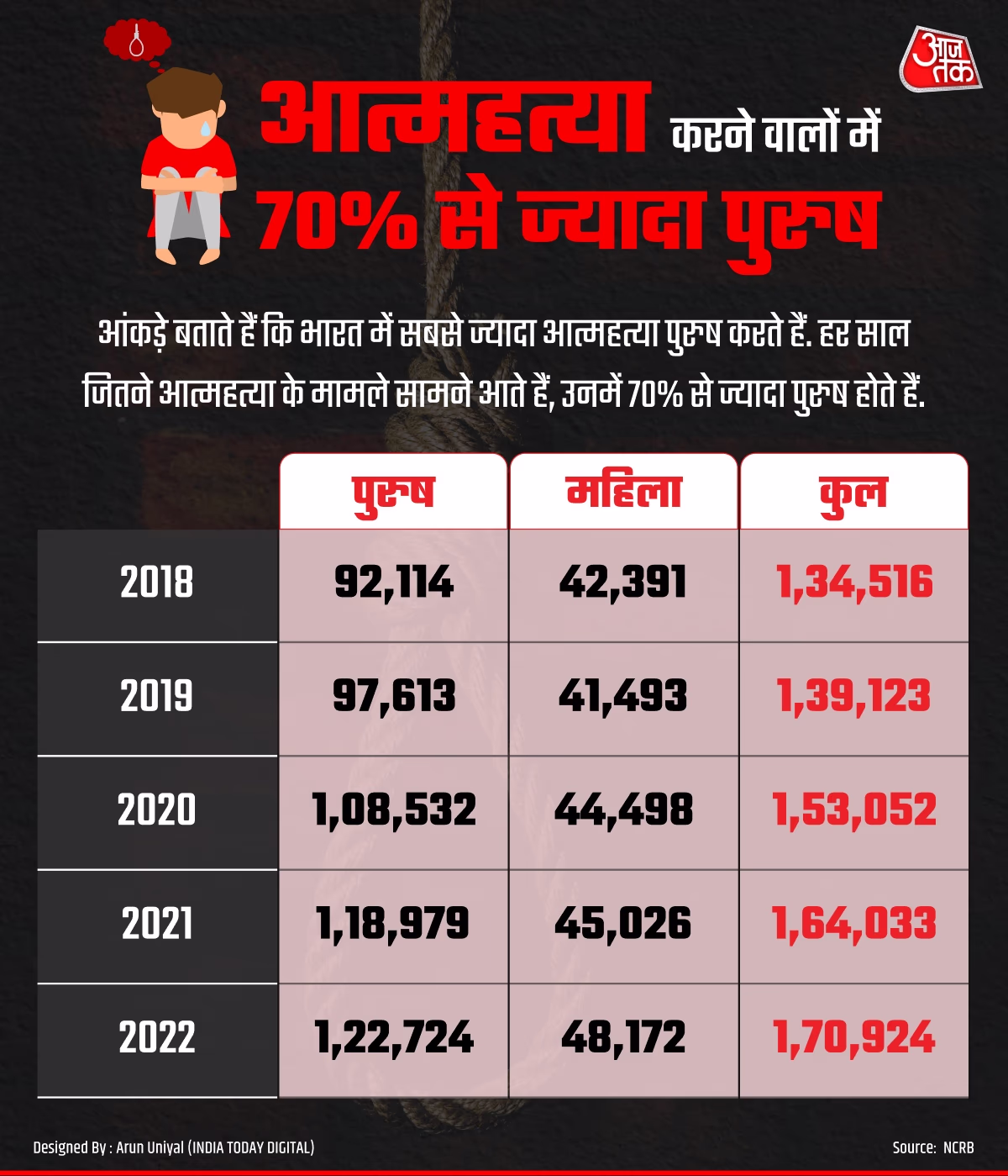 Two decades of data reveal that in India, 6 to 7 out of every 10 people who commit suicide are men. From 2001 to 2022, the number of women committing suicide ranged between 40,000 to 48,000 annually. Meanwhile, the number of men committing suicide increased from 66,000 to over 100,000.