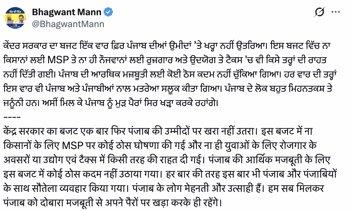 He criticized the budget for not taking strong steps to strengthen Punjab's economy, describing the central government's approach towards Punjab as neglectful.
