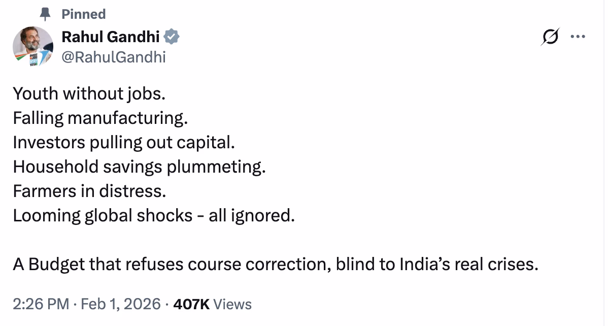 Congress leader and opposition figure Rahul Gandhi expressed his views on the Union Budget. In a post on X, Rahul stated, 'Unemployed youth. Declining manufacturing. Investors are withdrawing capital. Domestic savings are plummeting. Farmers are troubled. Upcoming global shocks - all ignored. A budget that refuses reform remains oblivious to India's real challenges.'